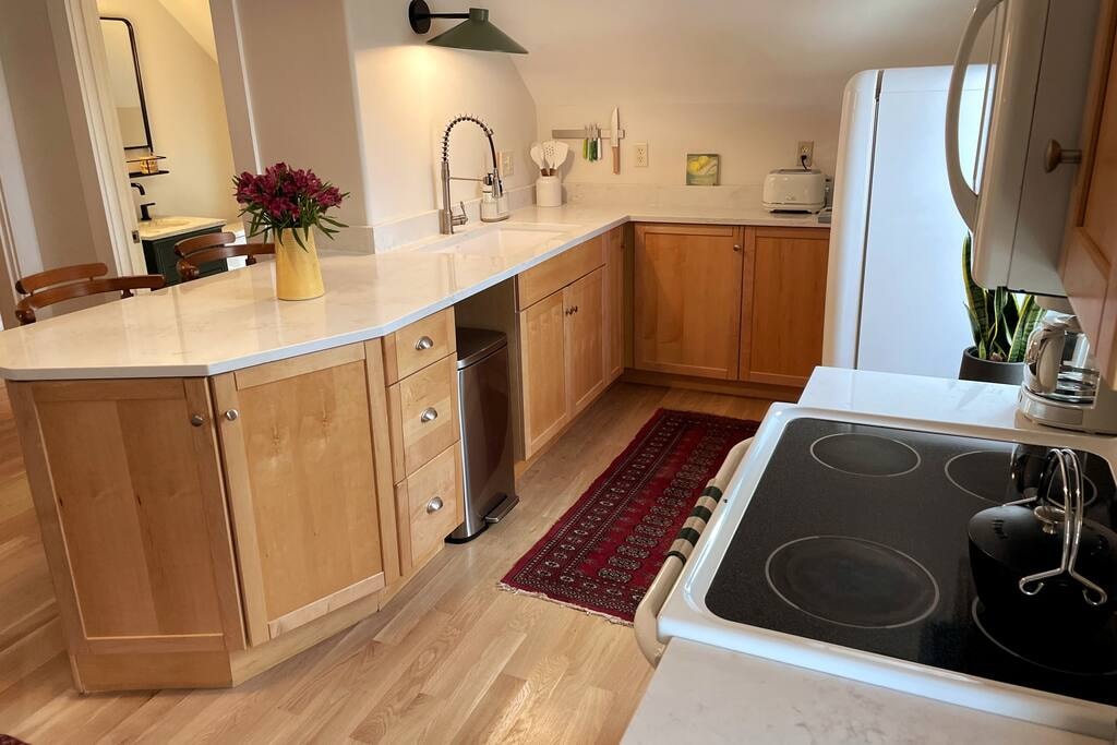 You'll arrive to a well lit private entrance, located in the back of the home with a smart lock keypad for key-less entry. A dedicated mudroom on the first floor is great to store winter boots in the winter or sandy shoes in the summer. A flight of stairs takes you up to the second level where the unit is located. A recently remodeled eat in kitchen is loaded with cooking supplies, ready for you to host your group. A half bath is conveniently located off of the kitchen and right next to the smaller bedroom with a twin sized bed. The living room is between the kitchen and primary bedroom with a couch and cable TV. The primary bedroom gets loads of natural light, has a walk in closet, a desk, and king bed. The full bath has everything you will need including soaps, shampoos, and full towel sets.